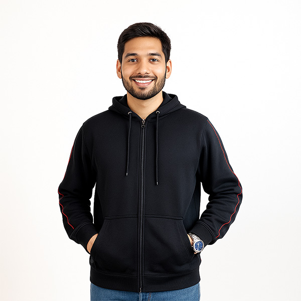 Stay cozy and stylish with our premium Brushed Fleece Hoodie made from 300 GSM self-fabric. Designed for men, this hoodie delivers the perfect blend of comfort, warmth, and everyday wearability. The soft interior, full-zip front, and contrast piping on the sleeves make it a go-to choice for casual outings, travel, or office wear. Whether you're layering up or wearing it solo, this hoodie keeps you effortlessly cool and comfortable.